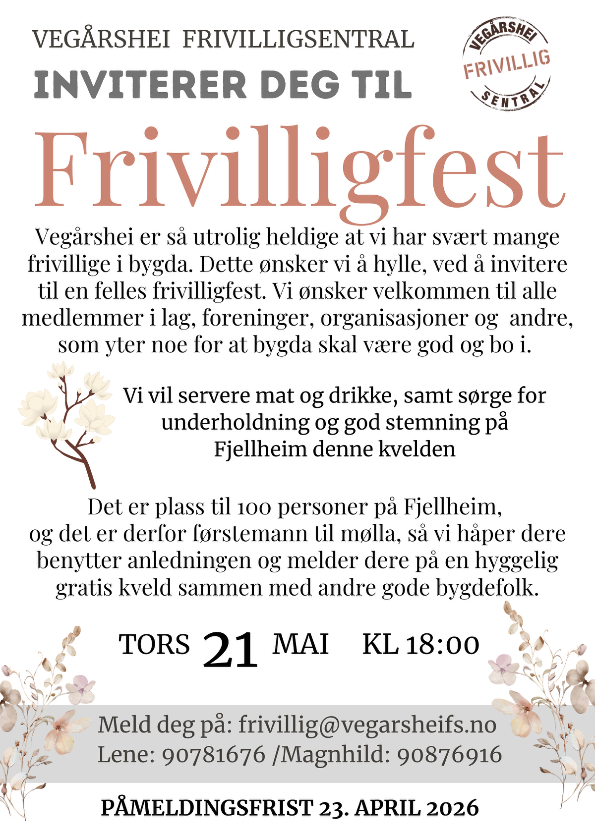 Vi inviterer DEG som er frivillig på Vegårshei til å bli med på vår frivilligfest den 21. mai 2026. Del gjerne informasjon om denne dagen med ditt lag, forening, organisasjon eller gruppe som du er frivillig i. Vi vil gjerne se dere alle! Husk at det er påmelding. Hjertelig velkommen!!